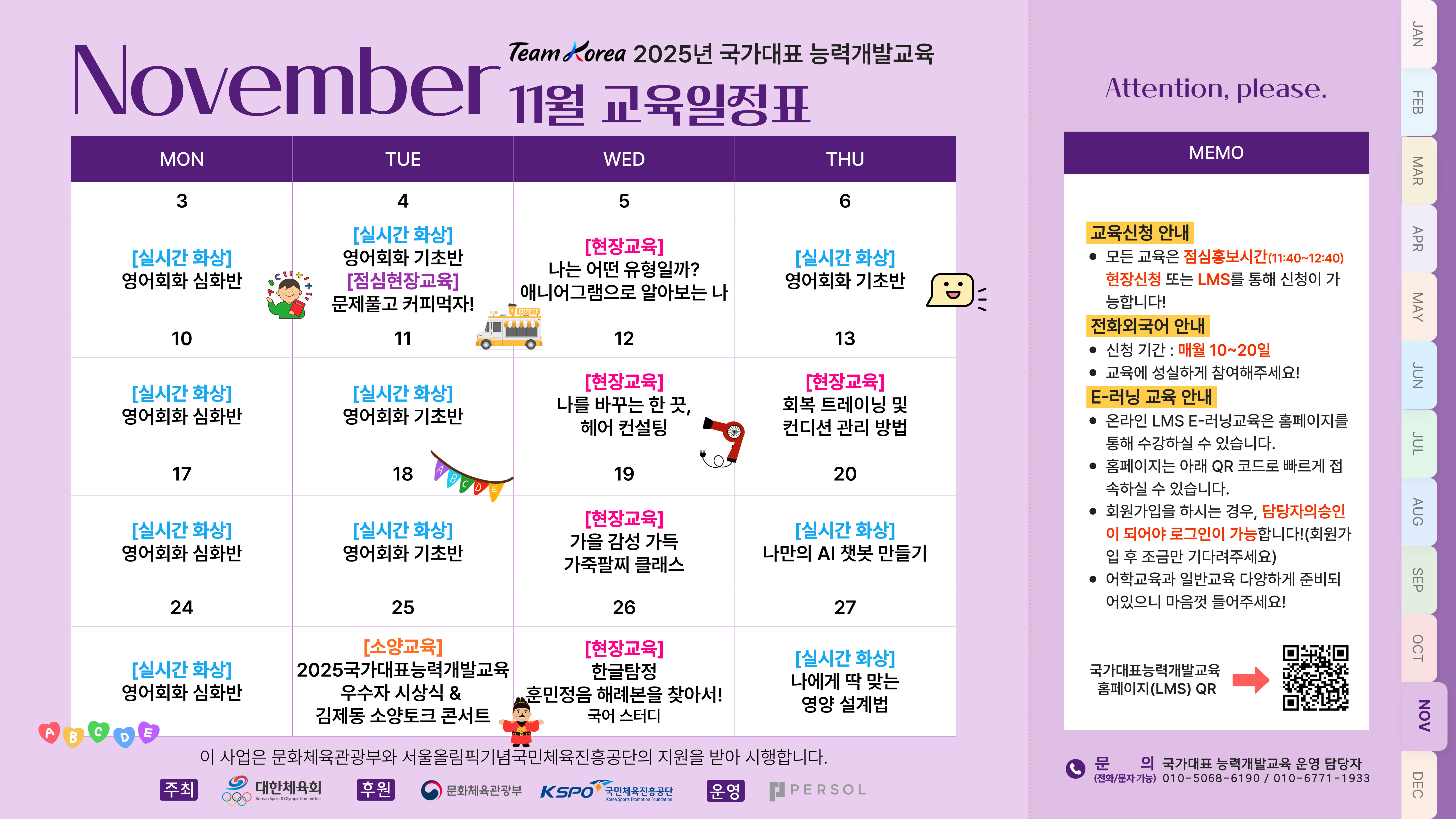 | 2025년 11월 국가대표 능력개발 교육 일정을 붙임과 같이 안내드립니다. □ 개요 o (사업명) 2025년 국가대표 능력개발 교육 o (대상) 국가대표 및 미래국가대표 선수와 지도자 o (목적) 입촌 선수들의 어학 및 일반분야 등 교과외학습을 비롯하여 학생선수의 교과 학습도 연계 지원함으로써, 선수들의 전인교육 실현 및 지속적인 역량 개발 도모 o (교육방법) 온·오프라인 병행 (대면, 집합교육, 실시간 화상, 전화, 온라인 등) o (교육내용) 어학, 인문·교양, 학생선수 학습지원, 경기력 향상 지원 교육 등 o (교육일정) 붙임 참조 (운영 상황에 따라, 프로그램 및 일정은 변동 가능) o (신청방법) - (현장) 진천 국가대표선수촌 선수식당 점심시간 홍보부스 운영 - (온라인) 국가대표 능력개발 교육 홈페이지(LMS) www.teamkoreaedu.com 붙임 11월 교육 일정표 1부. 끝. |
